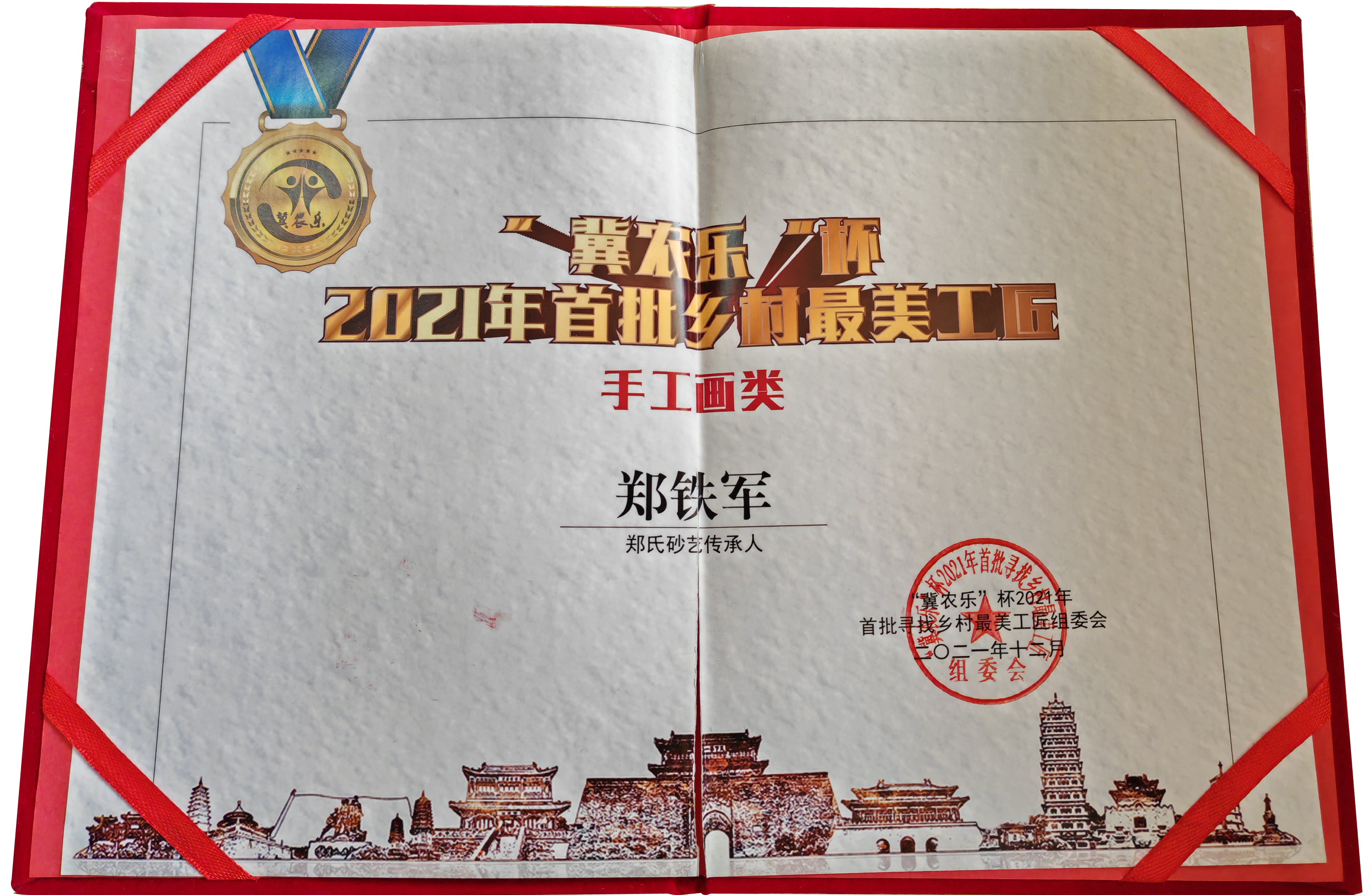 2021年,興隆縣鄭氏砂藝文化有限公司鄭鐵軍在“冀農(nóng)樂”2021年首批鄉(xiāng)村最美工匠——手工畫類 獲獎,并由“冀農(nóng)樂”杯2021年首批尋找鄉(xiāng)村最美工匠組委會頒發(fā)獎狀。