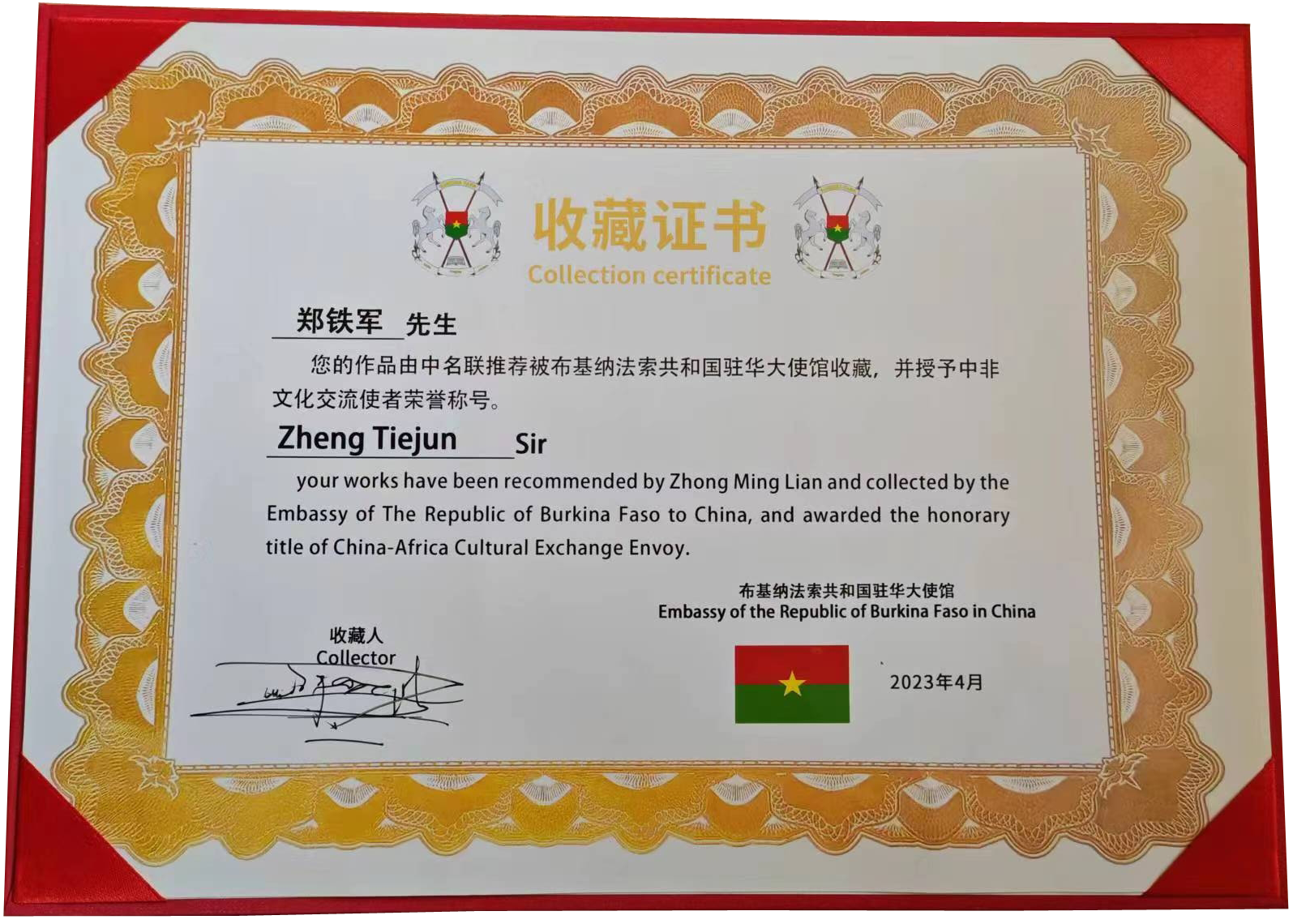 鄭鐵軍先生的作品曾多次參加國內大型會展,并被多家展館收藏。2023年4月,其作品再次被布基納法索共和國駐華大使館收藏并頒發證書,并被作為國禮收藏,為兩國友好合作的美好愿望添磚加瓦。