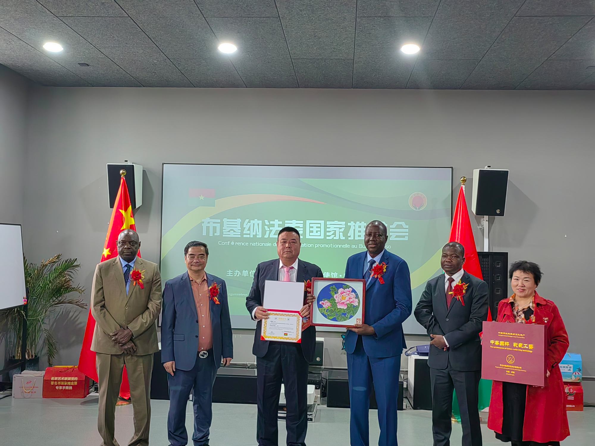 2023年4月12日,興隆縣鄭氏砂藝文化有限公司執行董事長鄭鐵軍參加由布基納法索駐華大使館.中名聯書畫培訓國際交流部主辦的“布基納法索國家推介會”和“中名聯191期經濟與藝術交流會”。會上,布基納法索共和國駐華大使團、商務代表團一行對鄭鐵軍的砂畫作品高度贊賞,并現場簽訂了訂購協議,頒發了收藏證書,授予鄭鐵軍“中非文化交流使者”榮譽稱號。