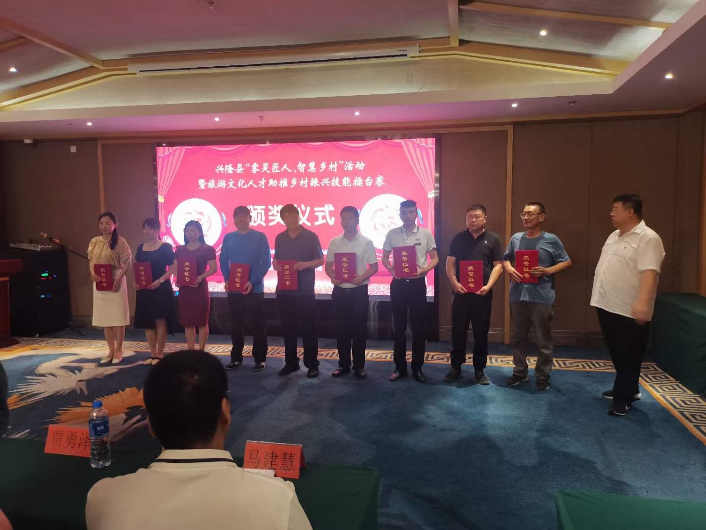 7月7日,興隆縣“霧靈匠人、智匯鄉村”活動暨旅游文化人才助推鄉村振興技能擂臺賽頒獎儀式在青松嶺鎮阿爾卡迪亞酒店盛大召開。興隆縣委常委、組織部長韓冰,縣人大常委會黨組副書記、總工會黨組書記、主席王立群,縣旅游和文化廣電局黨組書記、局長莊云飛,縣委組織部部務會成員、公務員局局長賈勇澤,縣總工會二級主任科員劉克友,旅游和文化廣電局副局長馬建慧等領導和獲獎藝術家們出席了頒獎儀式。