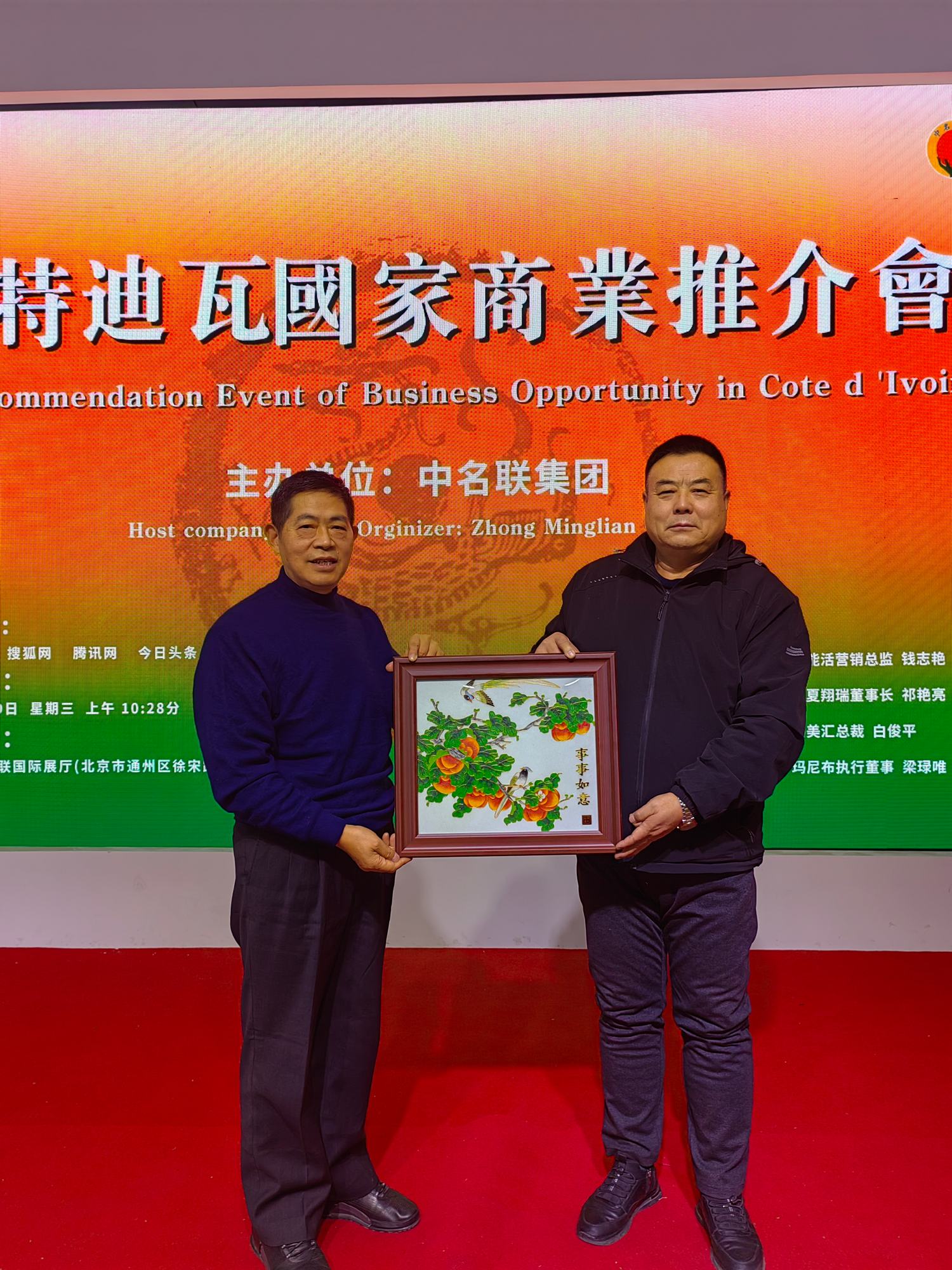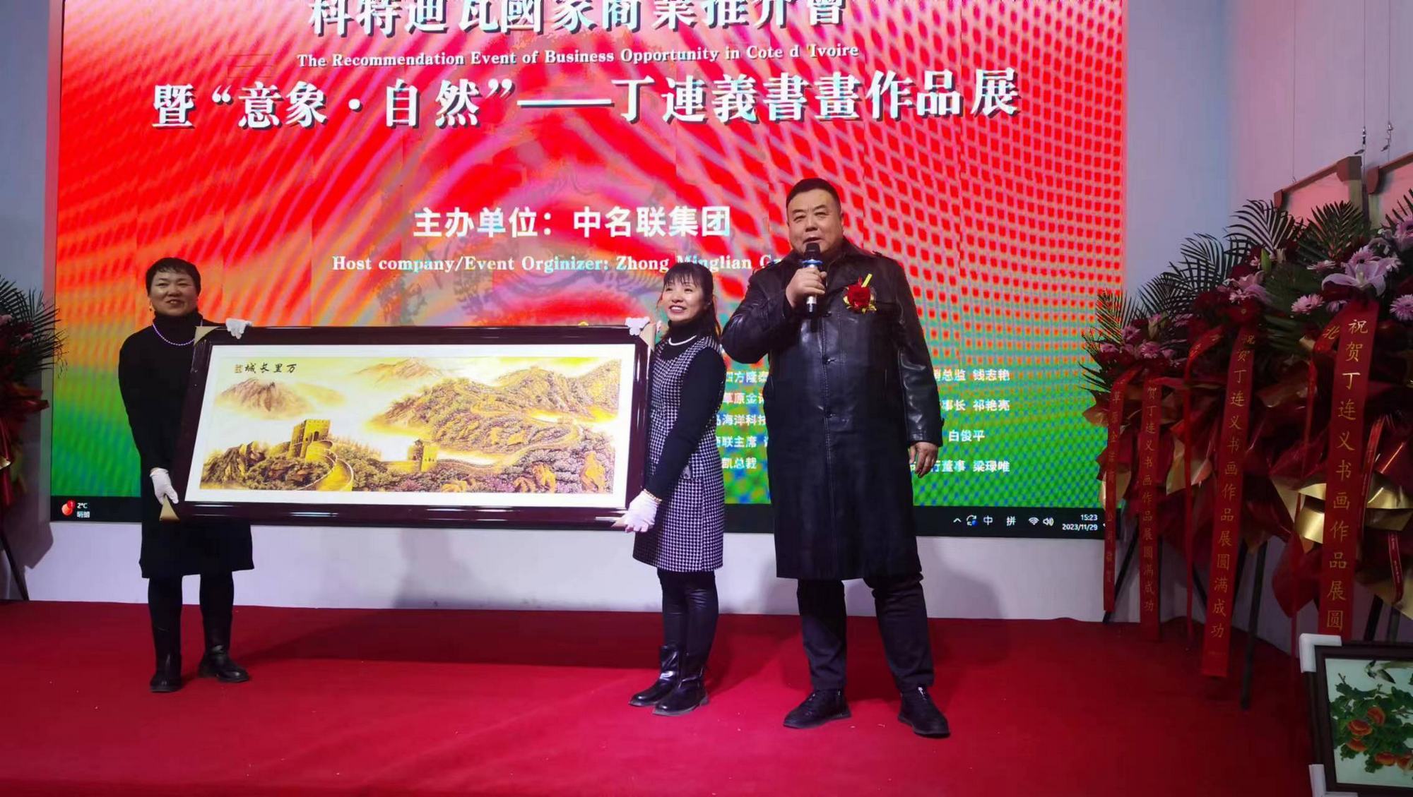 2023年11月29日,科特迪瓦國家商業推介會在北京中名聯國際展廳盛大召開,興隆縣鄭氏砂藝文化有限公司董事長鄭鐵軍應邀參加了此次推介會,鄭鐵軍董事長在會上對鄭氏砂藝的傳承和發展進行了簡要介紹,現場展示的鄭氏砂藝作品《興隆山楂》《旭日東升》《事事如意》等作品深受與會企業家贊揚,并進行了現場收藏。