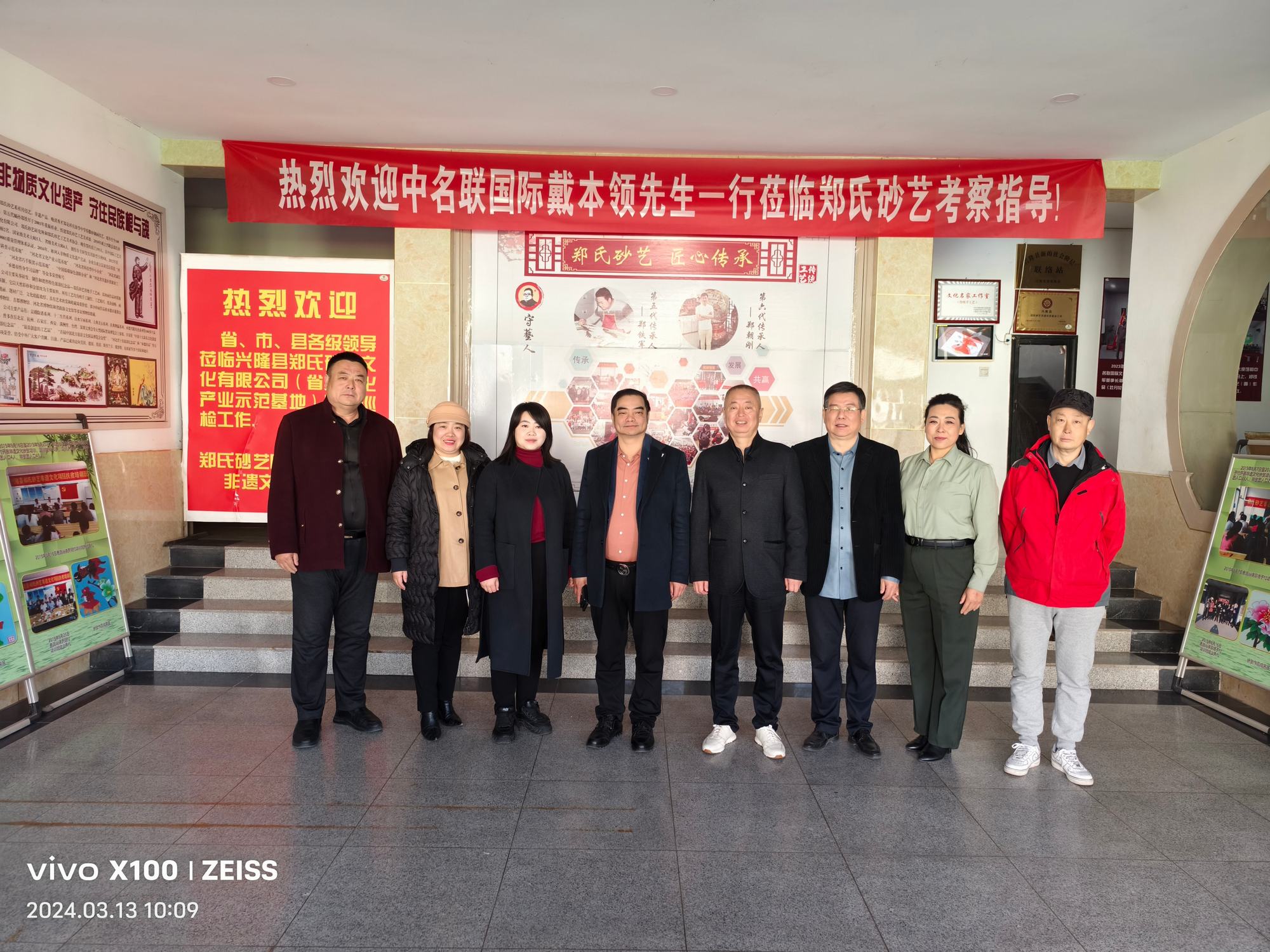 2024年3月12日至13日,中名聯國際戴本領總裁一行蒞臨興隆縣鄭氏砂藝文化有限公司,就鄭氏砂藝發展歷程、發展模式和發展規劃進行考察指導,一同前來的有原非遺司秘書趙萍,邯鄲市華冶工貿有限公司黨委書記、董事長、北京華納中創文化發展有限公司執行董事張書明,中國國務外事國賓禮特供藝術家、中國女畫家協會會員時愛華。興隆縣人大常委會黨組副書記、副主任高春青,興隆縣委宣傳部副部長、文明辦主任溫偉,清華大學文化與旅游產品設計研發中心原總監尹建民教授,鄭氏砂藝董事長鄭鐵軍等陪同參觀。