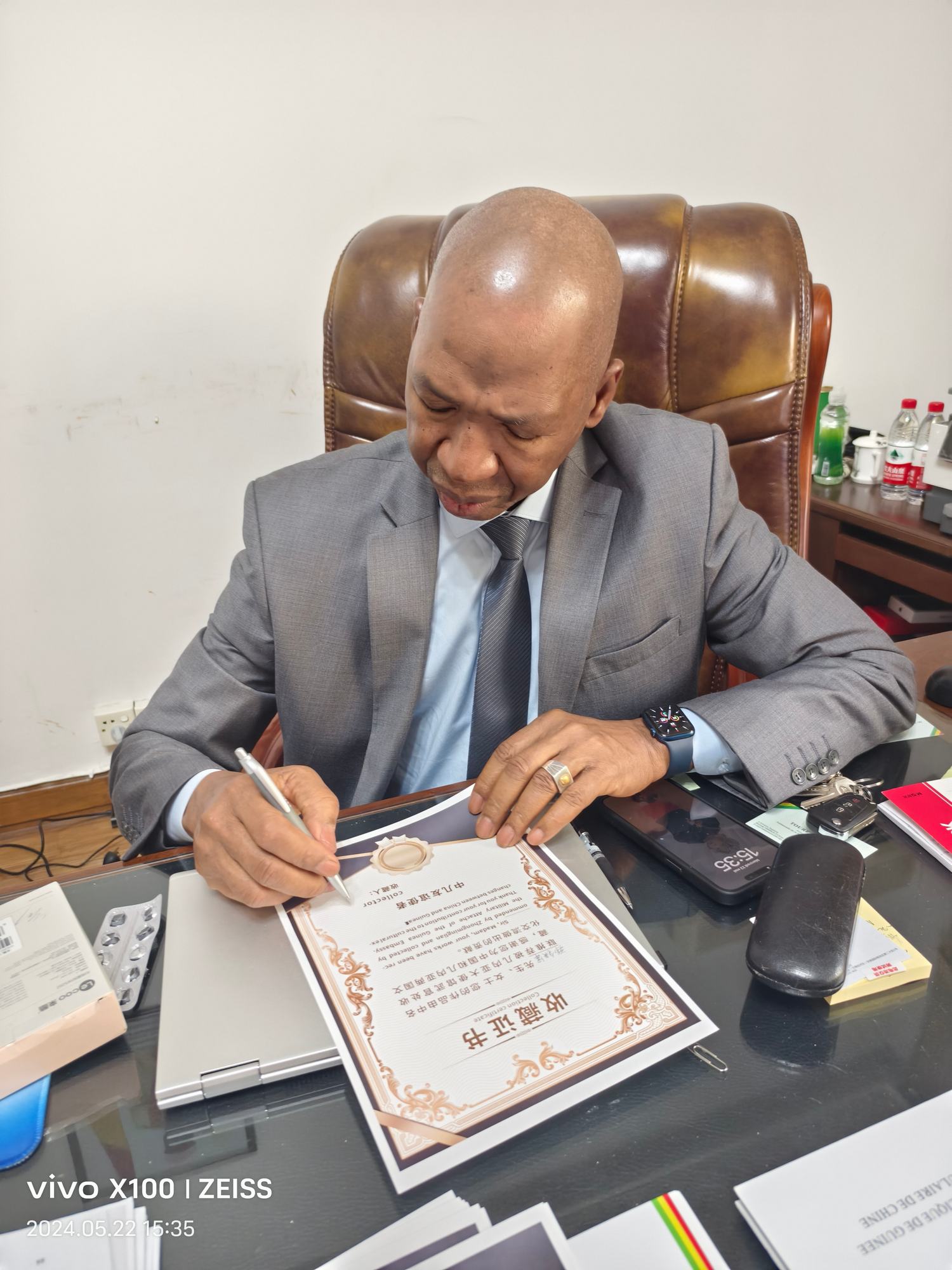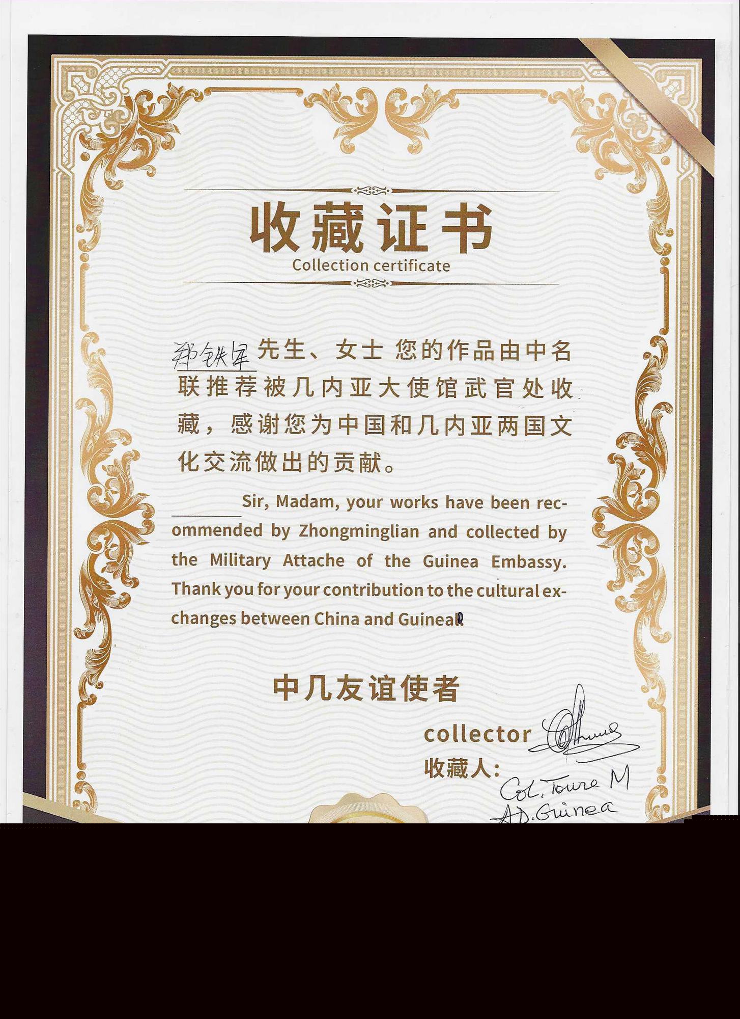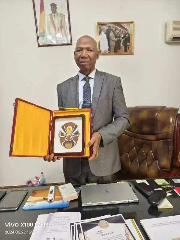 2024年5月22日,經(jīng)幾內(nèi)亞駐華大使誠(chéng)邀,中名聯(lián)推薦,中名聯(lián)簽約國(guó)禮藝術(shù)家鄭鐵軍的砂畫(huà)系列作品走進(jìn)幾內(nèi)亞共和國(guó)駐華大使館,其中砂畫(huà)作品《臉譜》被幾內(nèi)亞駐華大使館作為國(guó)禮珍藏,并授予鄭鐵軍中幾文化交流使者榮譽(yù)稱號(hào)。